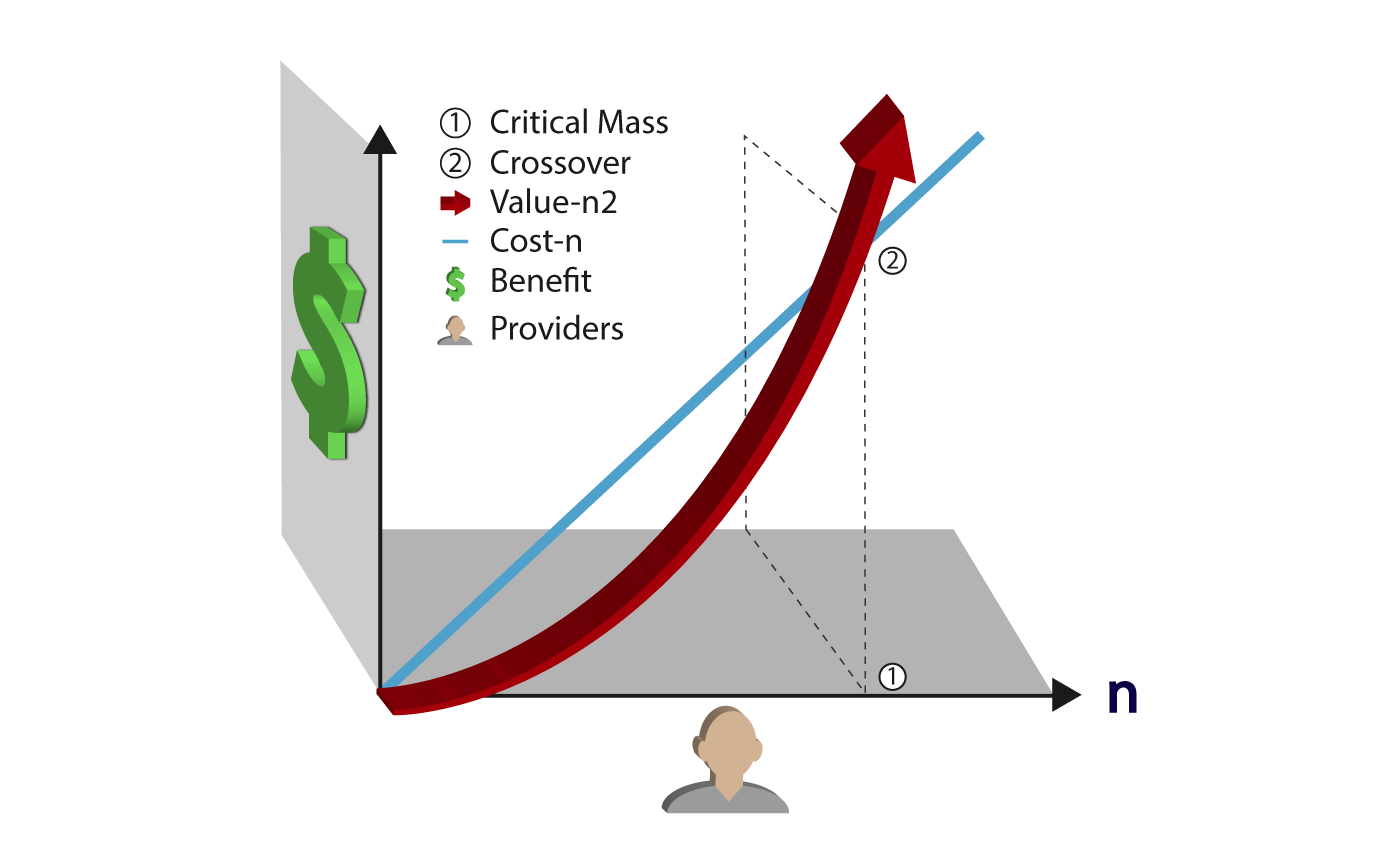 For ClicniMind, the network effect (also known as Metcalfe’s law) says that while ClinicMind’s costs are proportional to the number of submitted claims, the value of ClinicMind is proportional to the square of the number of practice owners using it. For example, if you multiply the number of ClinicMind users by 10, your systemwide cost goes up by a factor of 10, but the value goes up a hundredfold. In other words, Metcalfe’s law, as applied to ClinicMind, says that the value of ClinicMind to the individual practice owner is proportional to the number, n, of other practice owners who share the same billing knowledge base and processes. Now, multiply this value by the number of practice owners, and you have a value for the whole operation that’s roughly proportional to n2 .